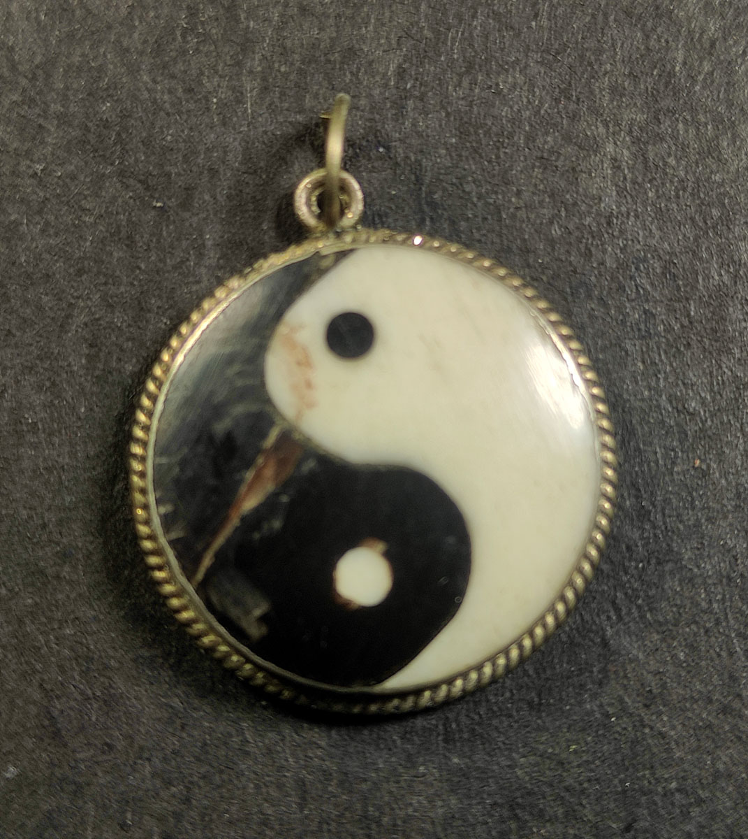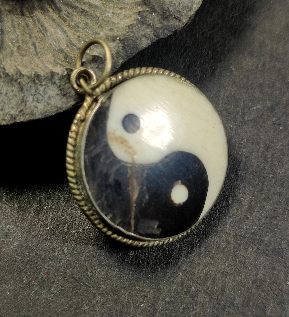 This is a gorgeous Buddhist amulet, all handmade by the artisans of Patan Nepal. The white part of the pendant is the bovine bone and the black part is Horn.