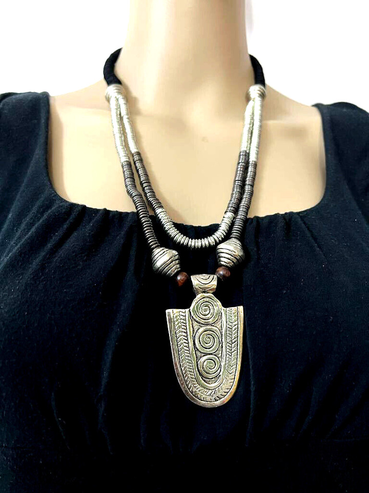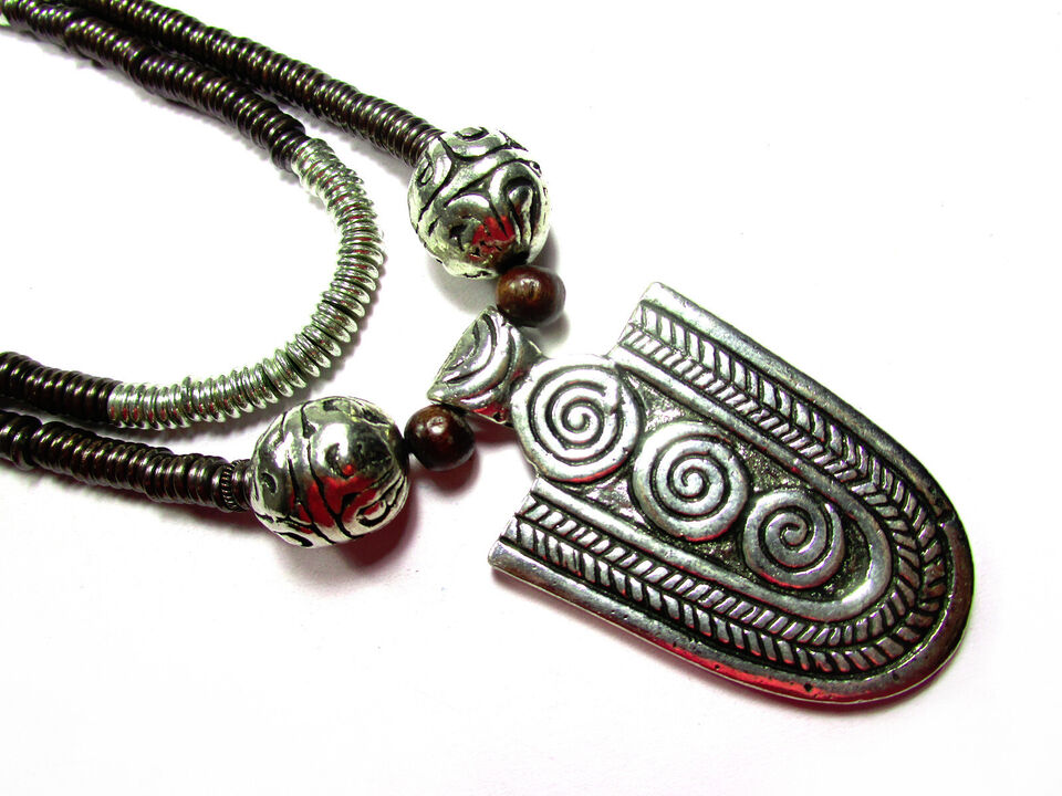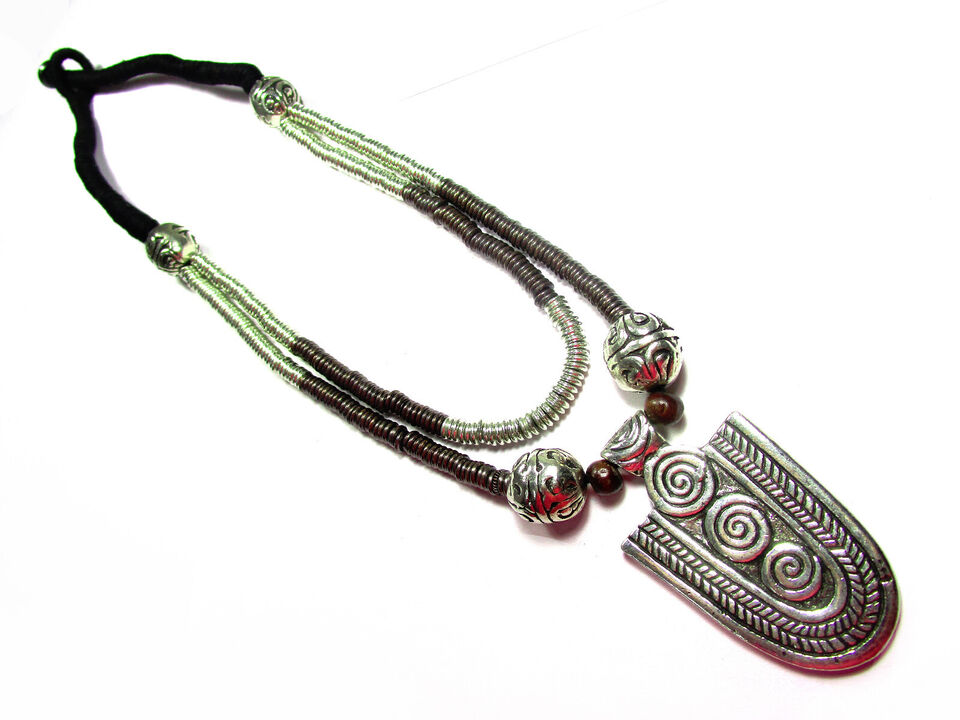 This is a beautiful handmade solid brass ring spiral tribal ethnic pendant. Necklace from Nepal. The closer has a bone piece. Very unique got to have necklace for party, ramp or for daily use.