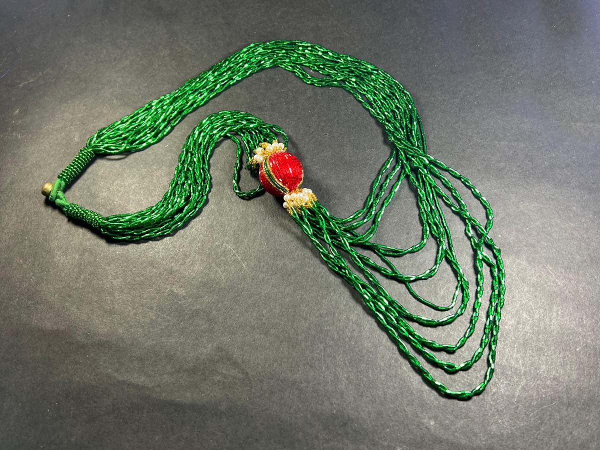 Celebrate tradition with this beautiful Nepali Pote Mala Necklace, meticulously handcrafted with vibrant glass beads. A stunning piece that combines color, culture, and craftsmanship, making it a perfect accessory for weddings, festivals, or special occasions. The necklace features a unique lotus-carved brass ball clasp for an elegant finish, adding a touch of artistic flair.