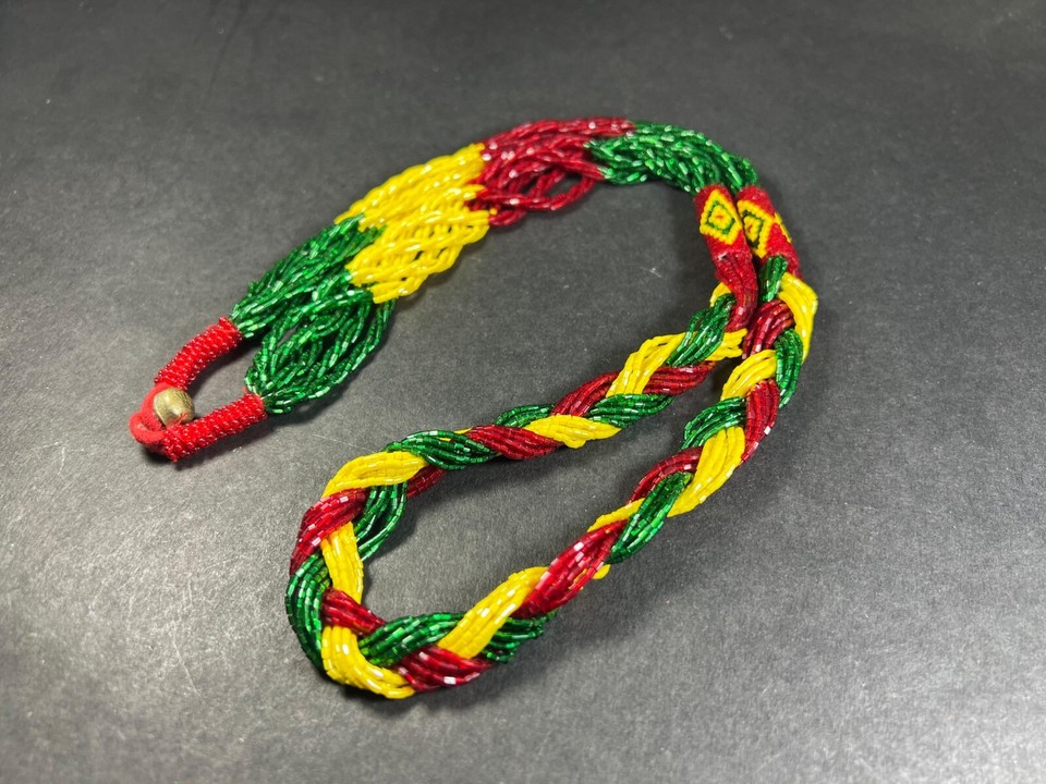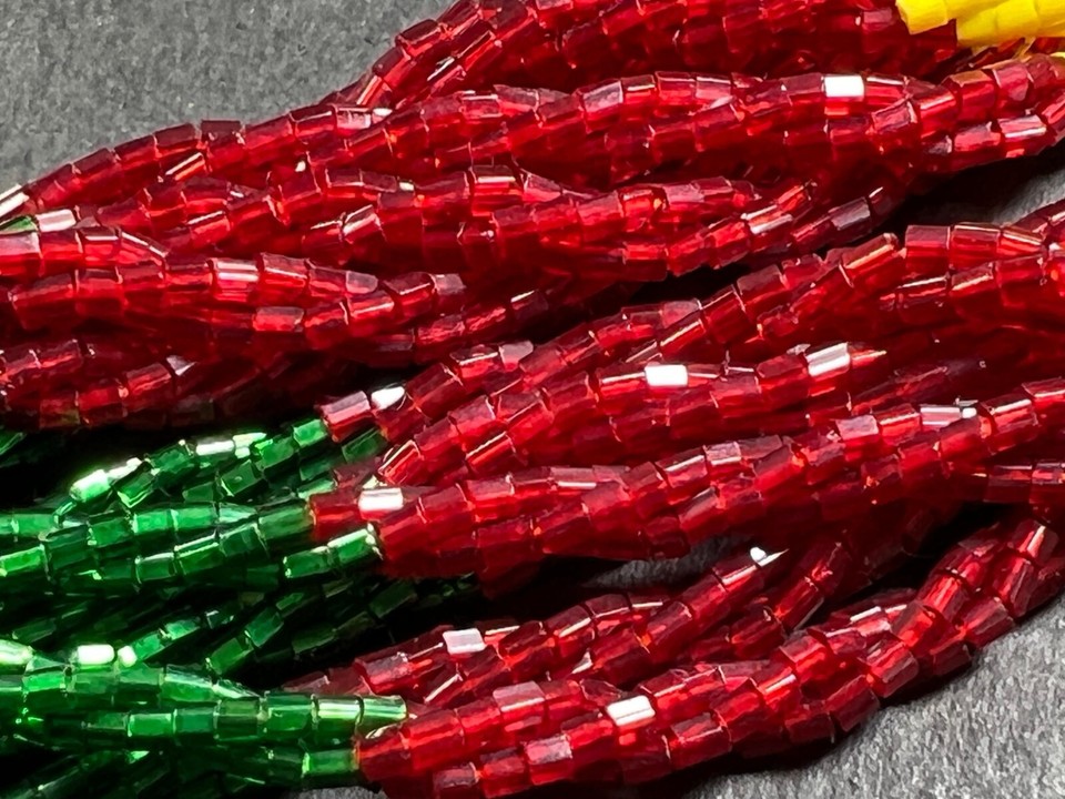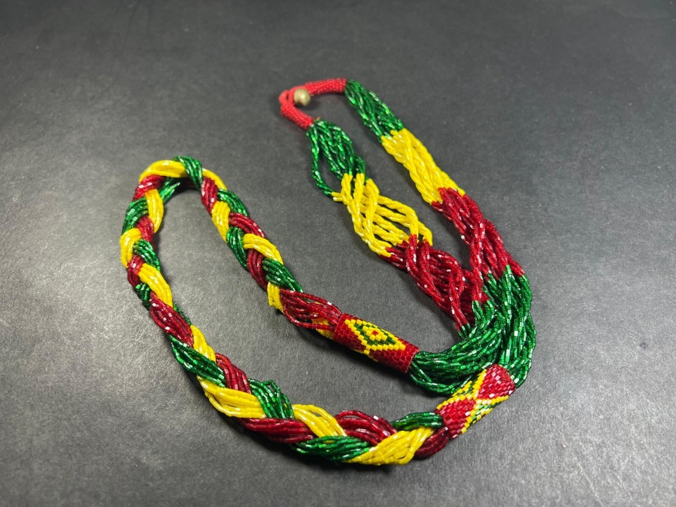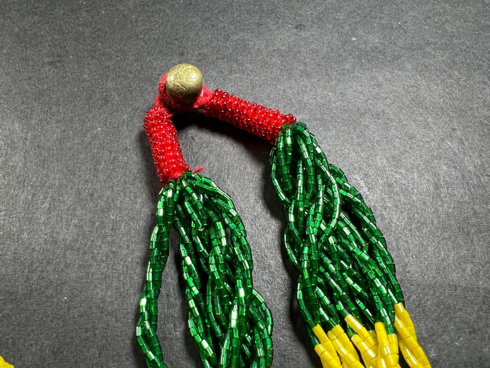 Usually made of tiny glass beads, the common color is green, but other colors like red and yellow are also seen.