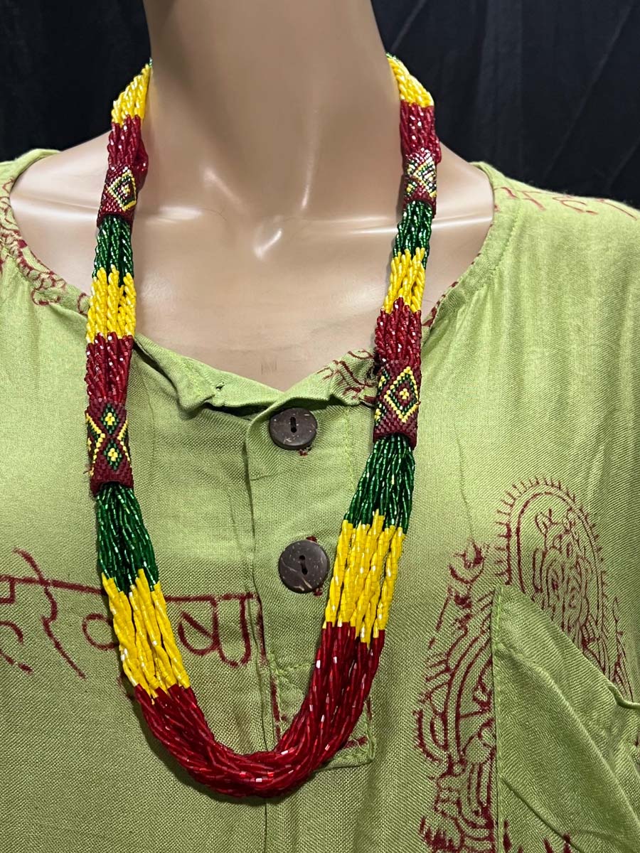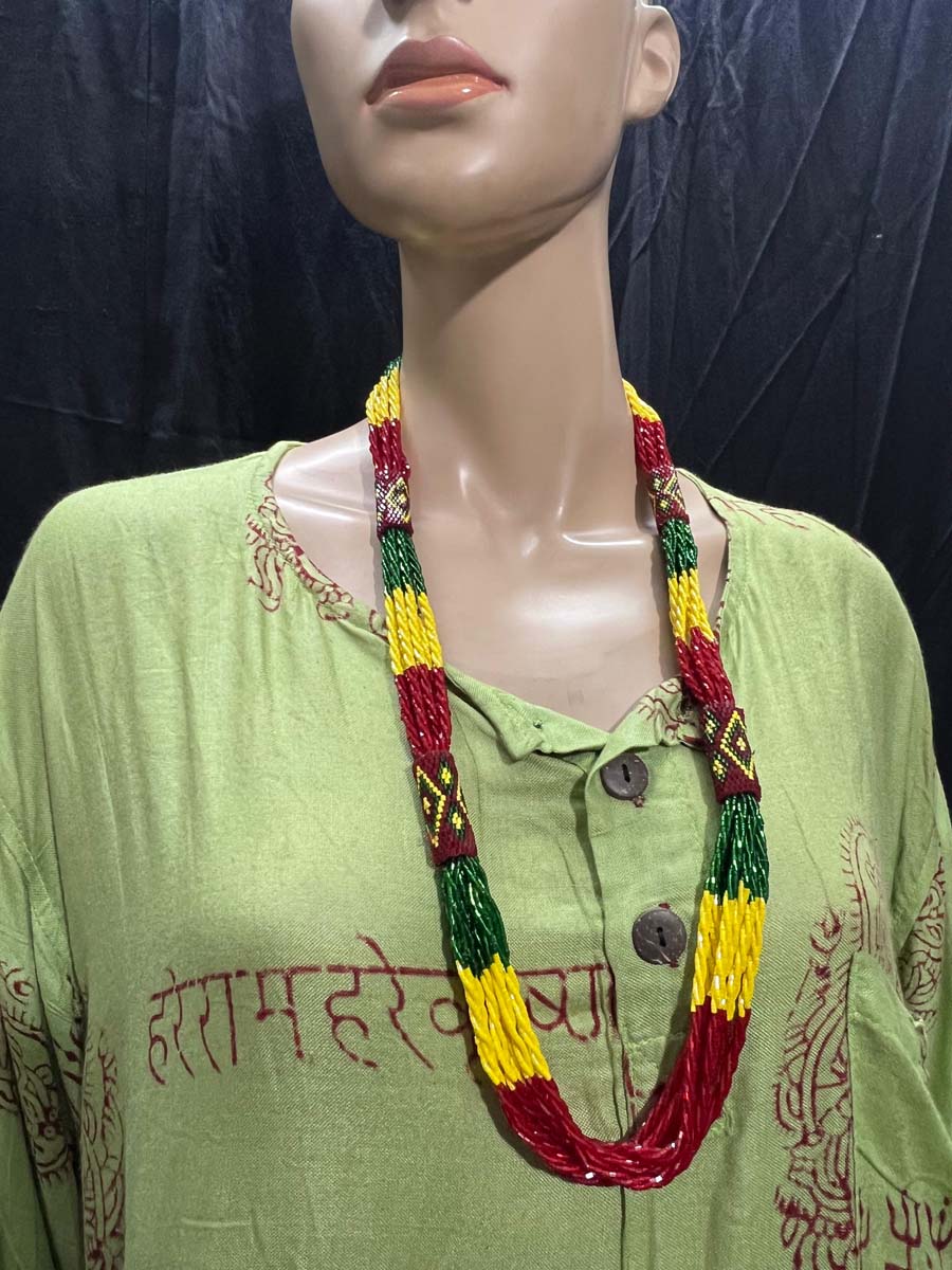 Celebrate tradition with this beautiful Nepali Pote Mala Necklace, meticulously handcrafted with vibrant glass beads. A stunning piece that combines color, culture, and craftsmanship, making it a perfect accessory for weddings, festivals, or special occasions. The necklace features a unique lotus-carved brass ball clasp for an elegant finish, adding a touch of artistic flair.