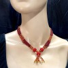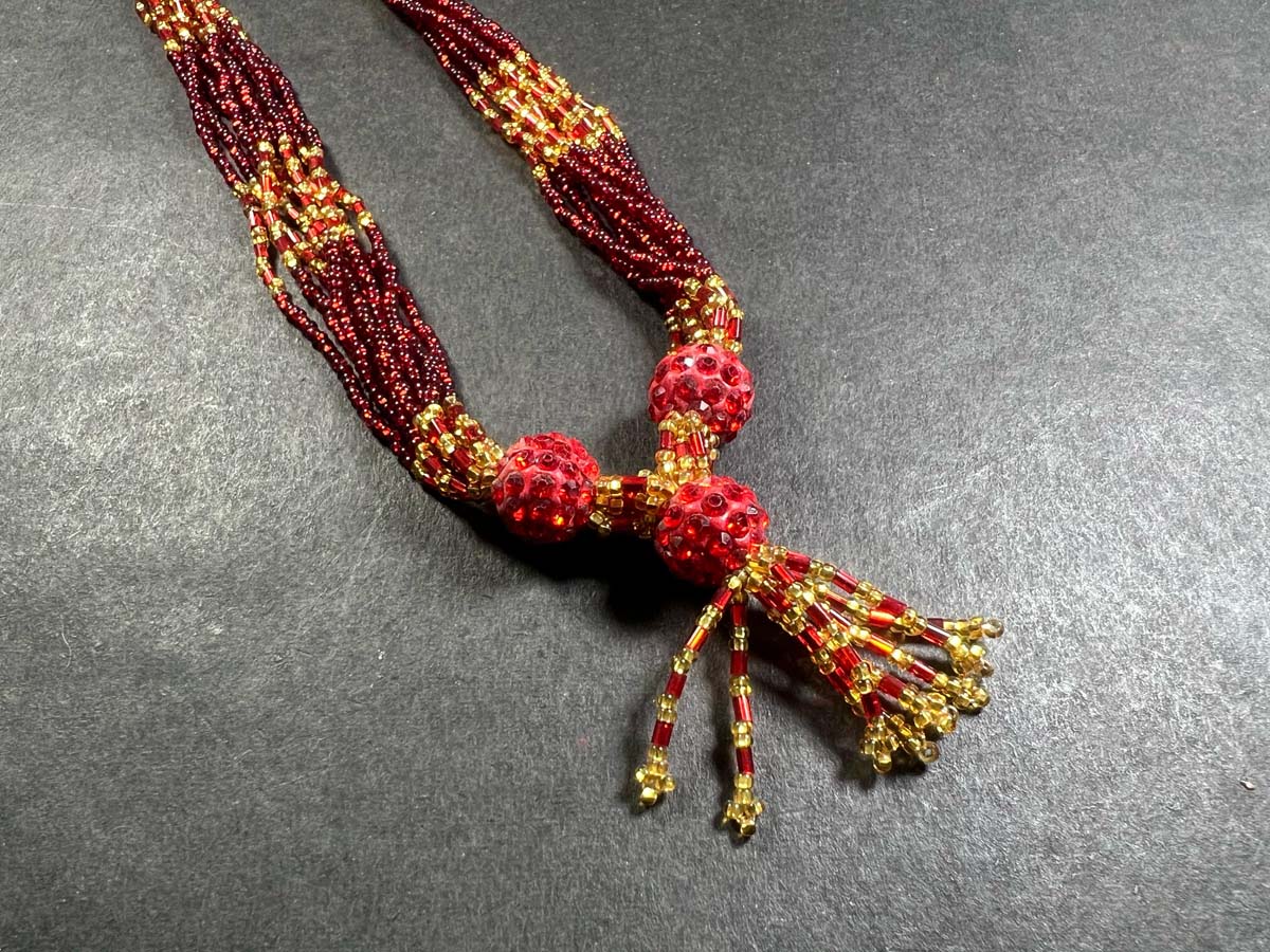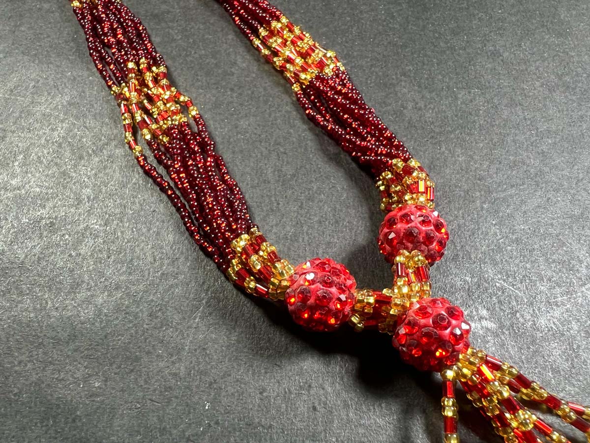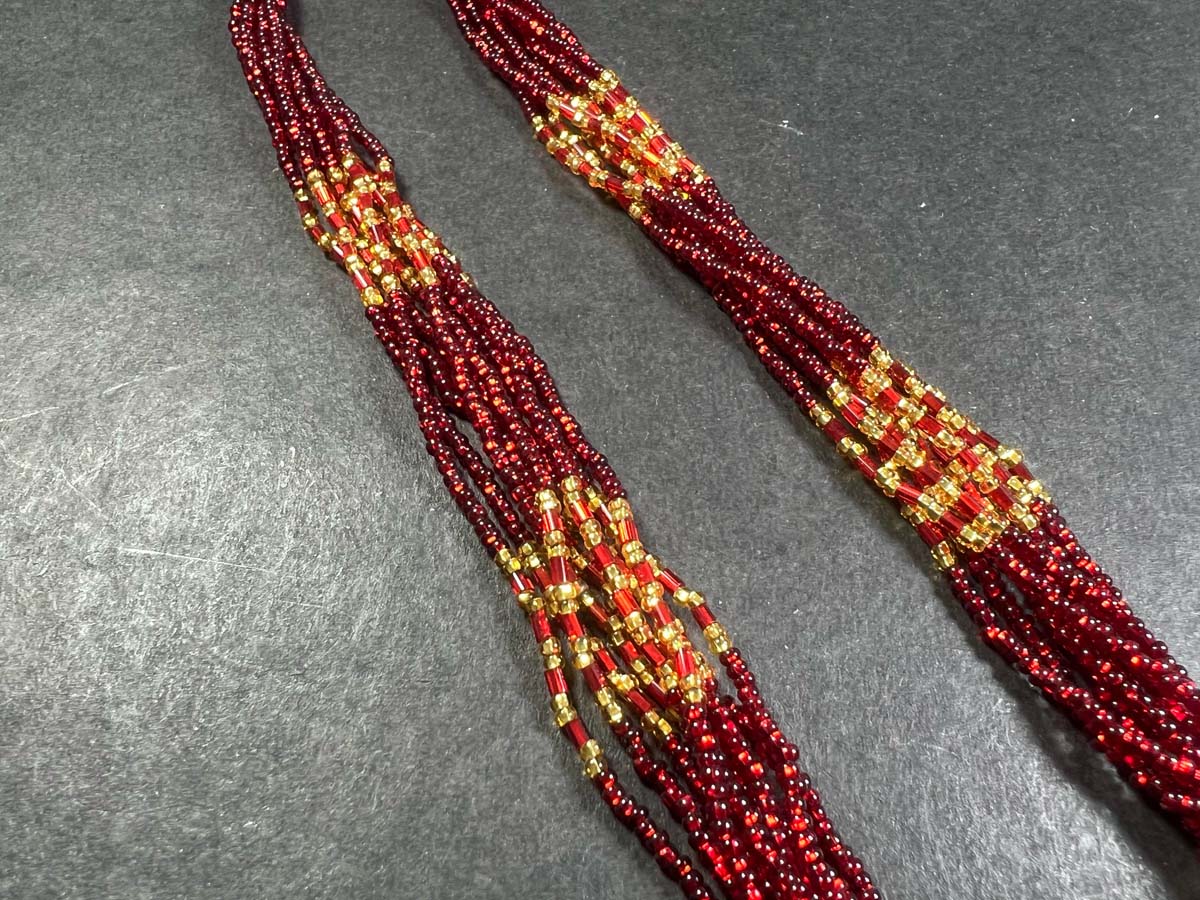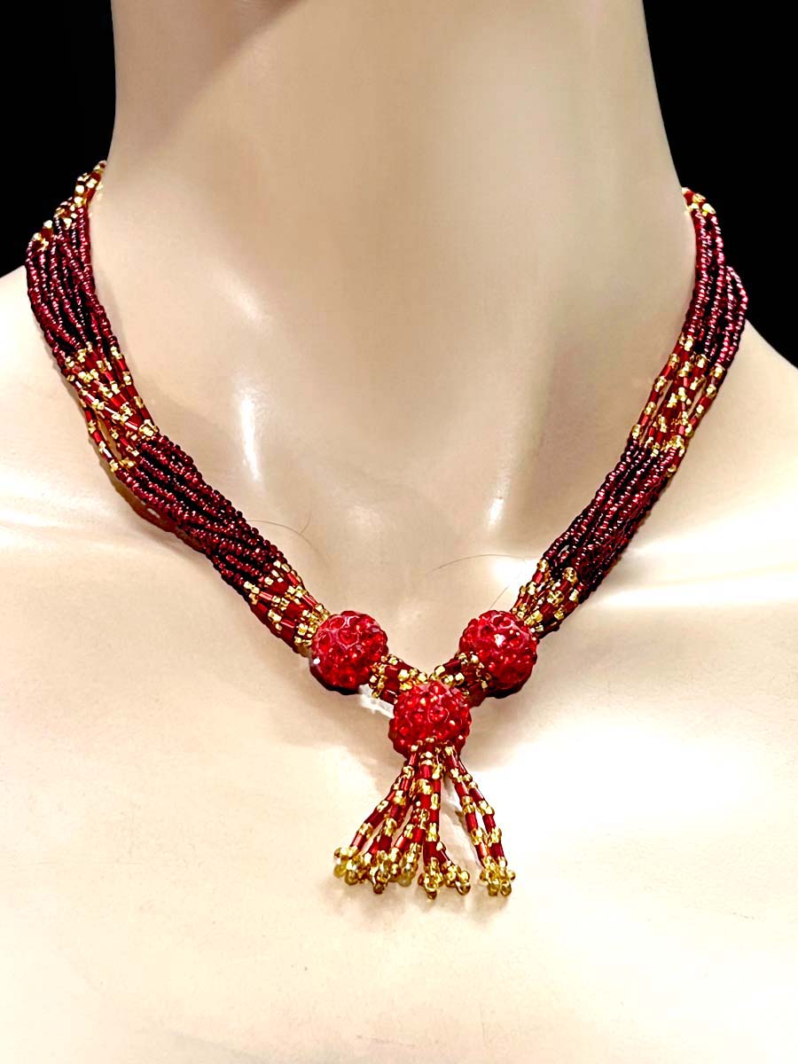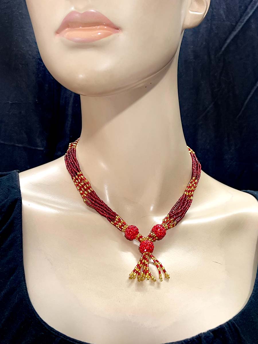 The design can vary from simple single-strand necklaces to multi-layered, elaborate versions.
