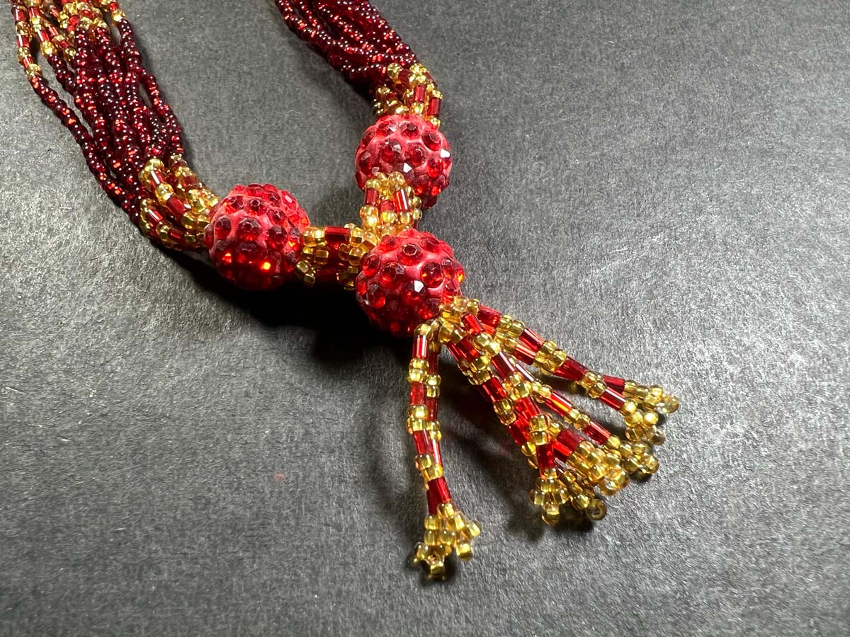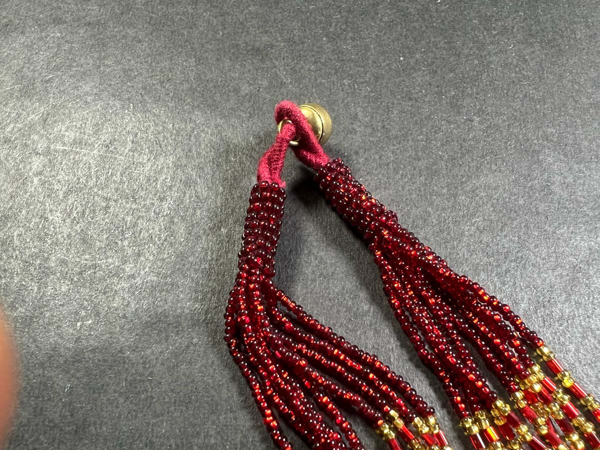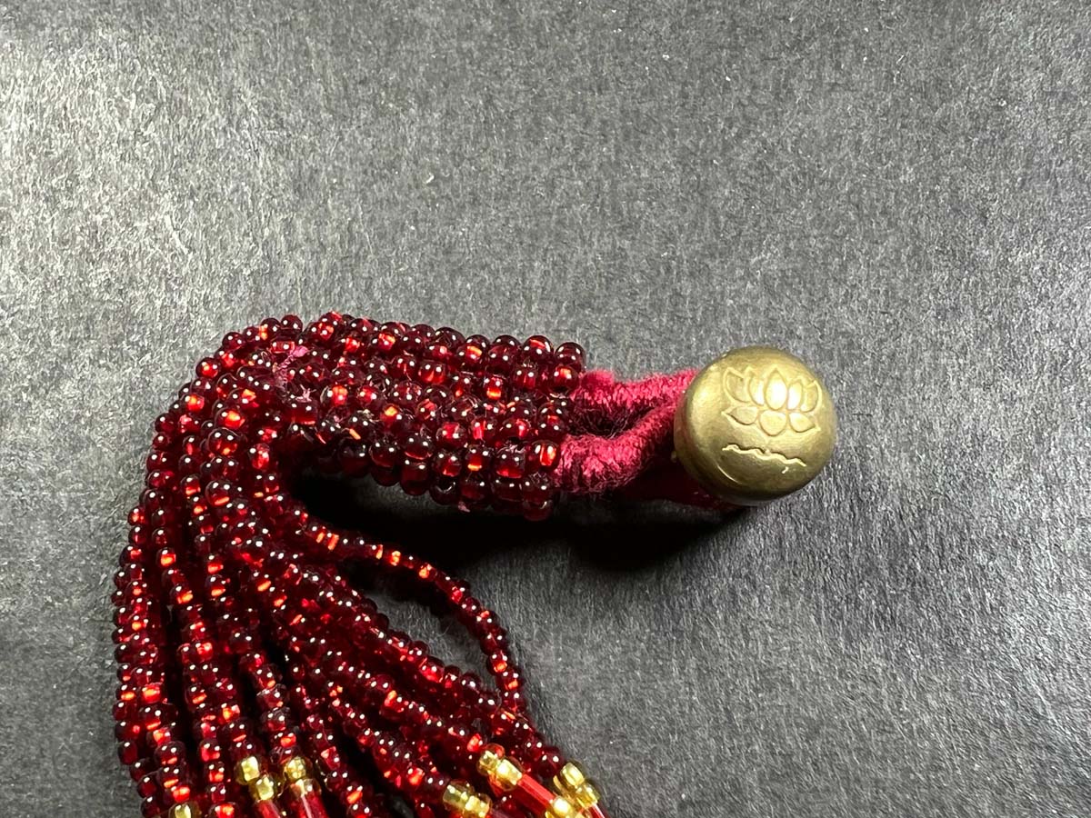 Usually made of tiny glass beads, the common color is green, but other colors like red and yellow are also seen.