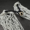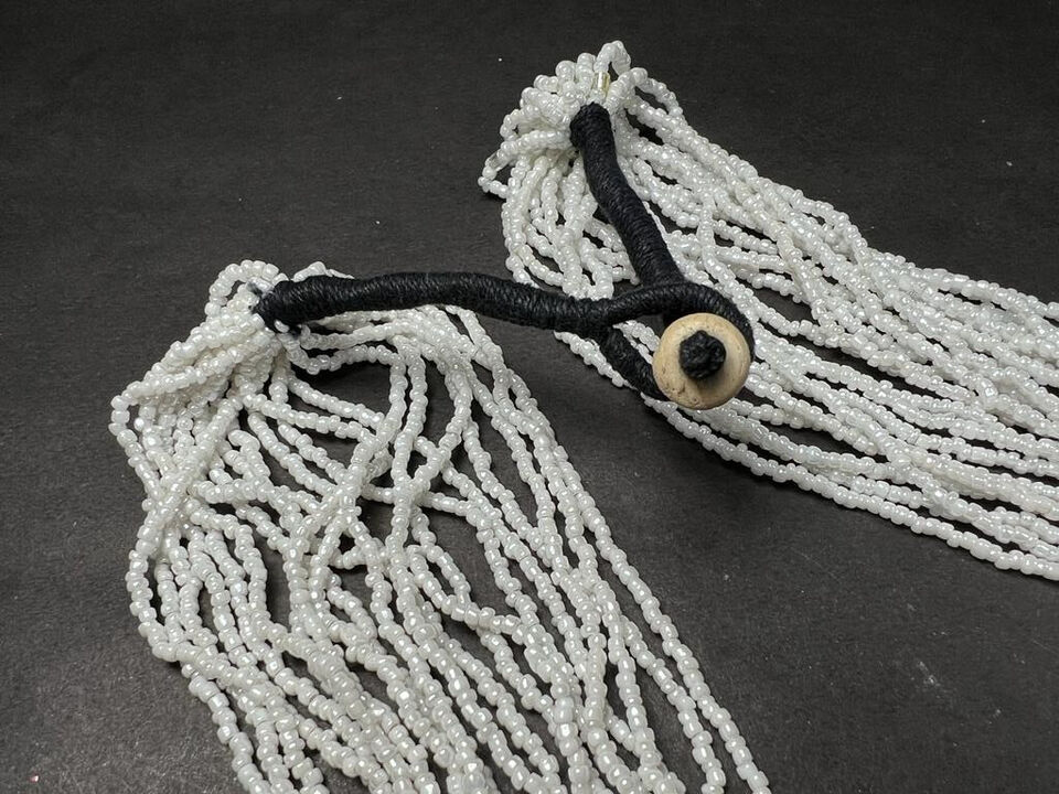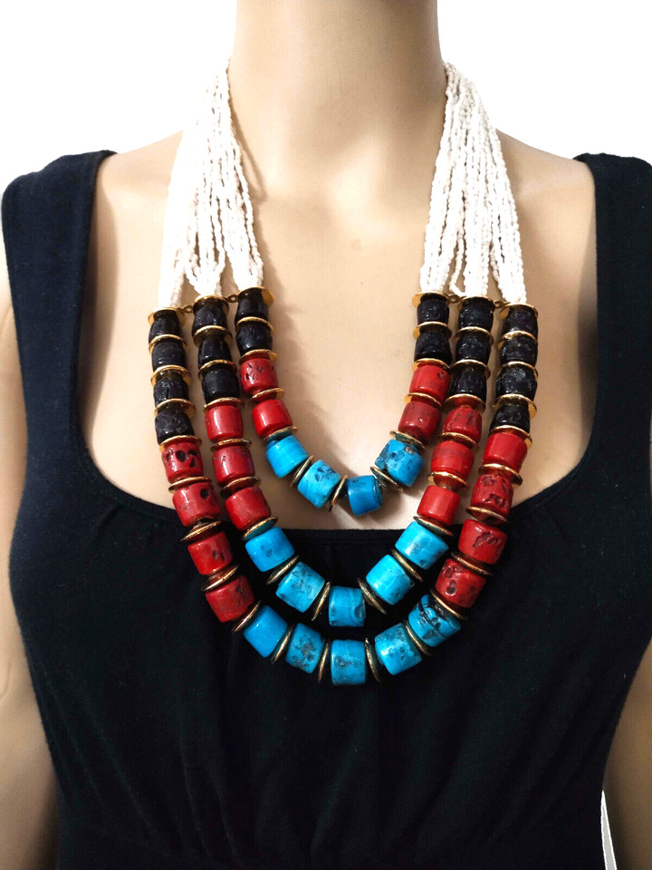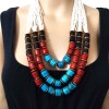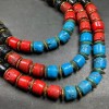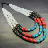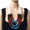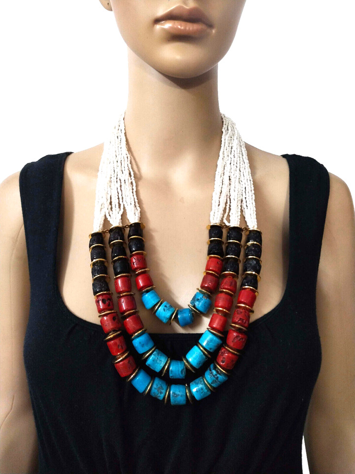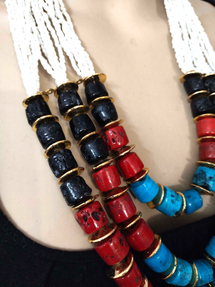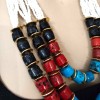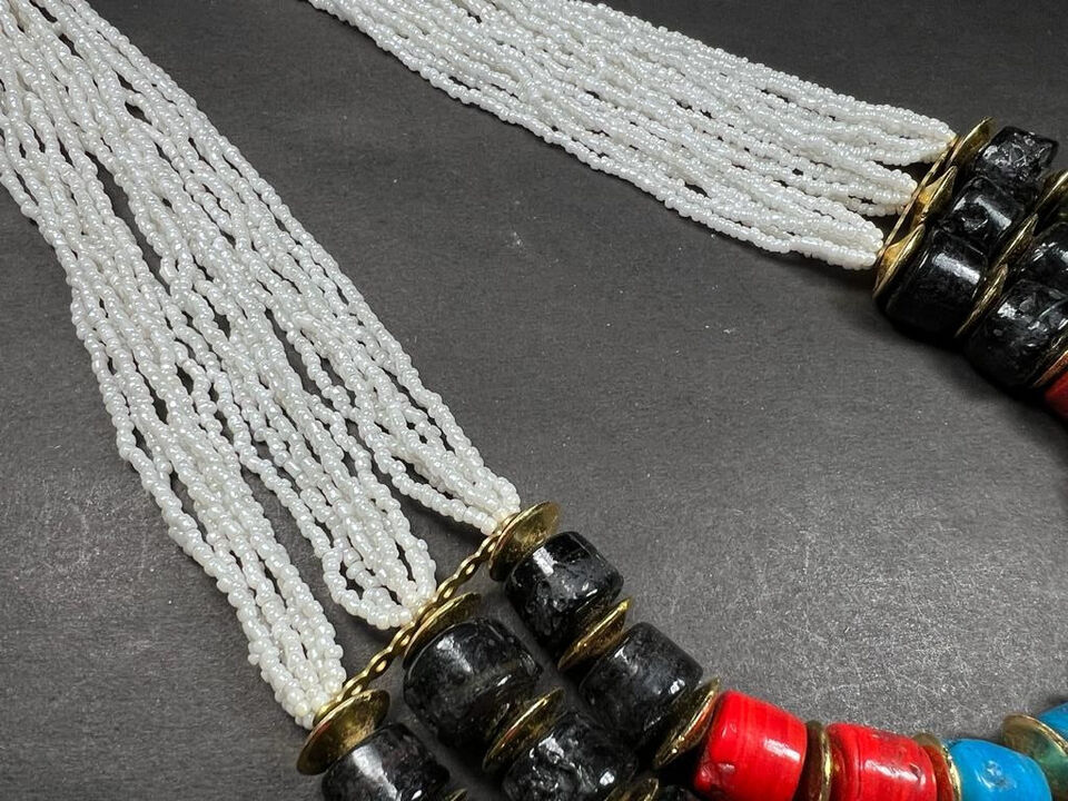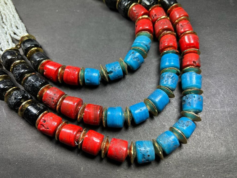 This striking necklace features a multi-strand design with blue, red, black and white glass beads embodying the bold and intricate style of Naga tribal craftsmanship.