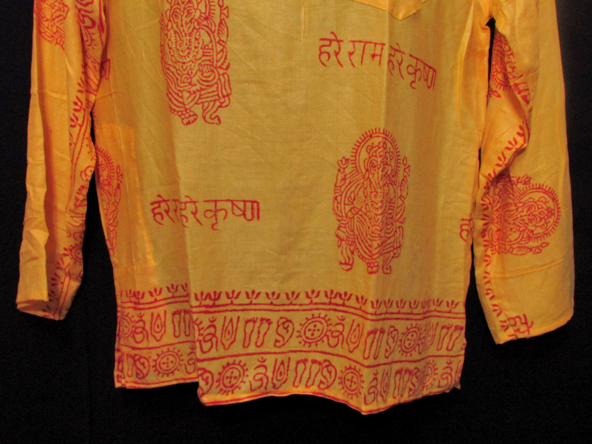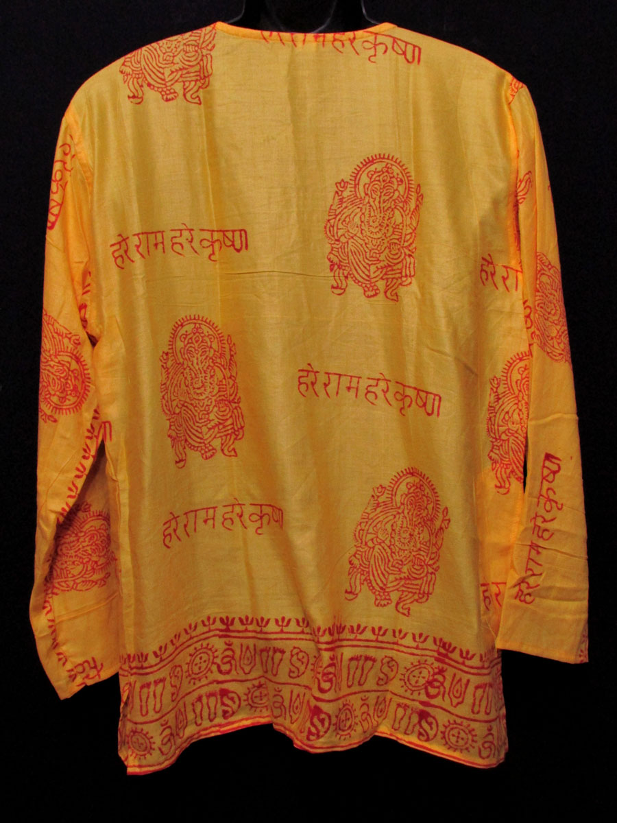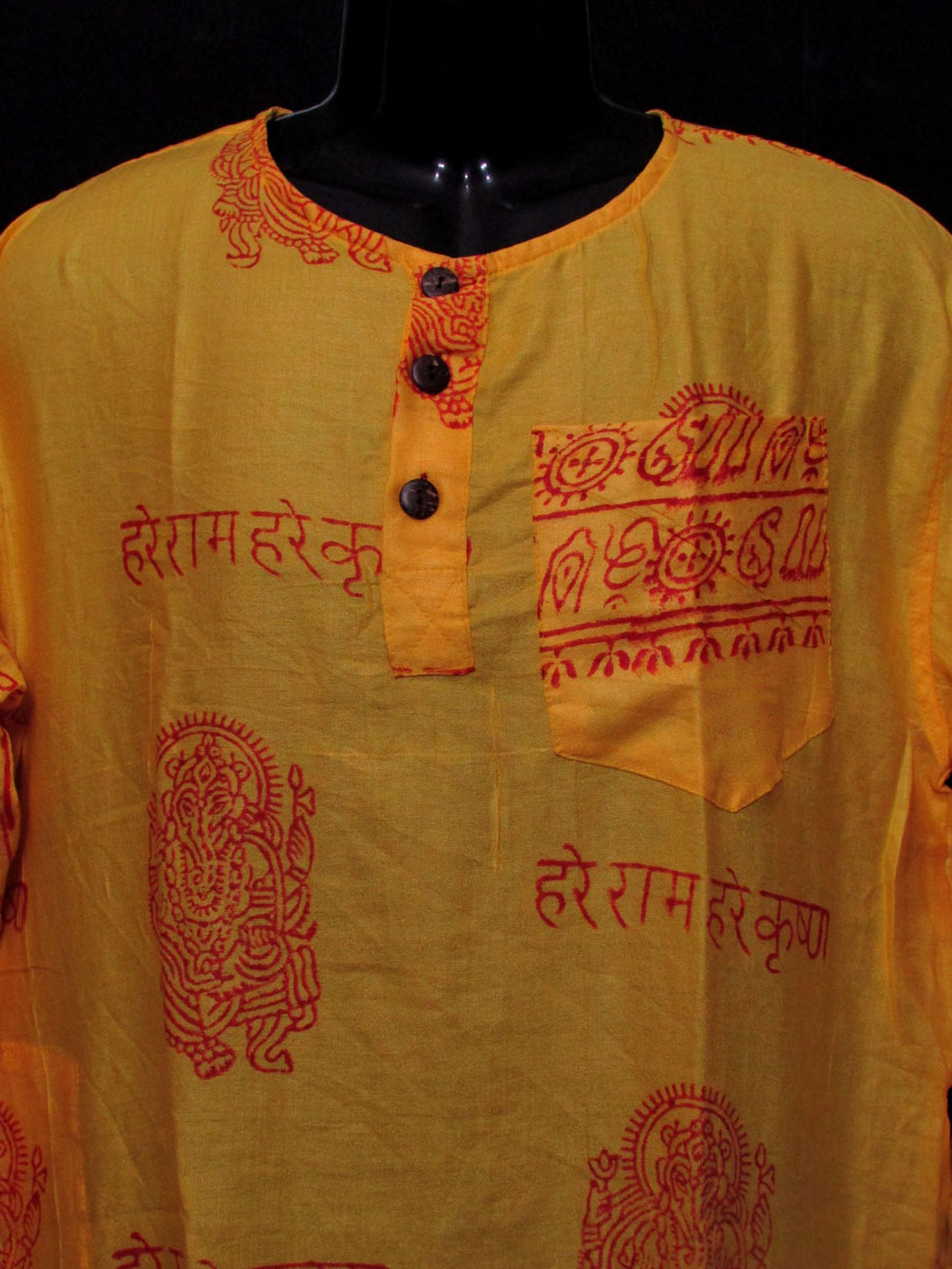 This a brand new (with tag) garment "Hare Rama Hare krishna" Lord Ganesha and other sacred symbols block printed shirt from Nepal. This is a top having three unique wood button, one pocket on left front chest and one side pocket in the right with long sleeve which looks very classic and stylish. We can use it as casual wear in the summer.The print is of very good quality. This shirt should be hand washed separately in cold water.