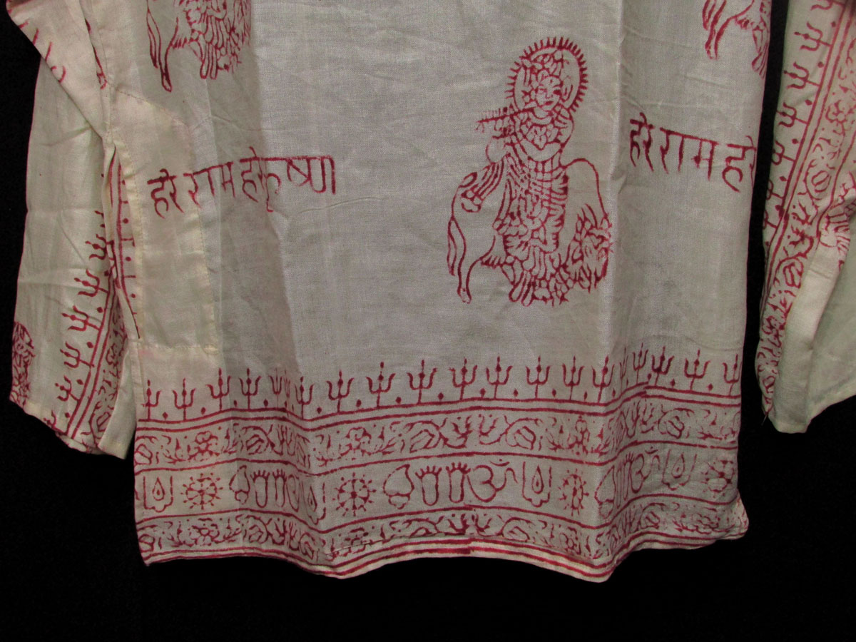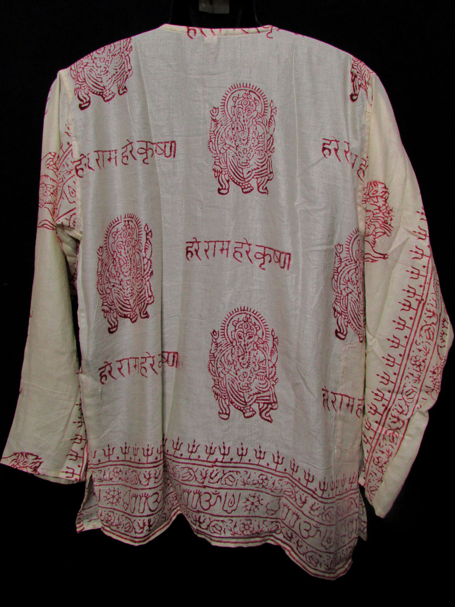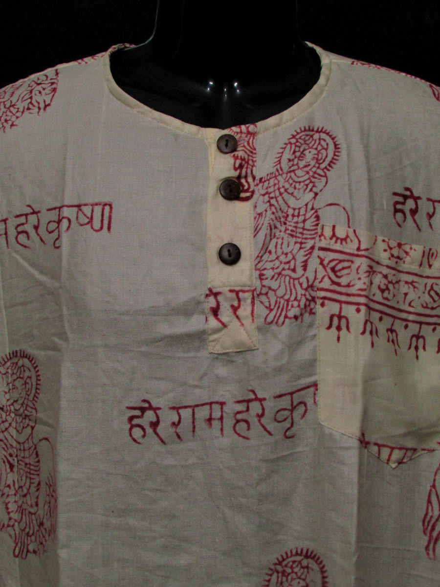 This a brand new (with tag) garment "Hare Rama Hare krishna" Lord Krishna and other sacred symbols block printed shirt from Nepal. This is a top having three unique wood button, one pocket on left front chest and one side pocket in the right with long sleeve which looks very classic and stylish. We can use it as casual wear in the summer.The print is of very good quality. This shirt should be hand washed separately in cold water.