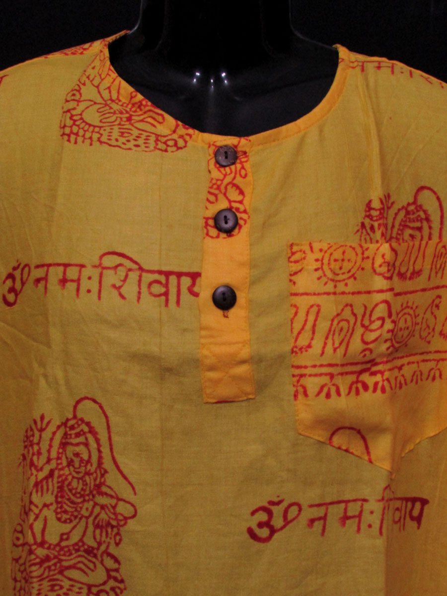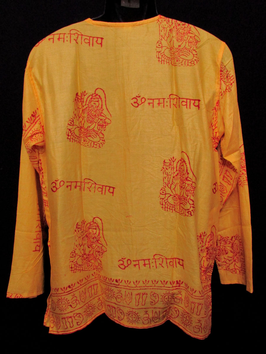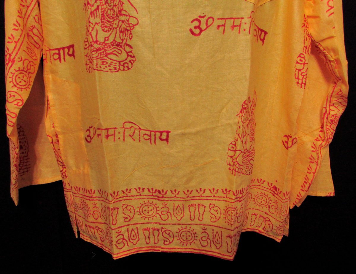This a brand new (with tag) garment "Om Namaha Shivaya" Lord Shiva and other sacred symbols block printed shirt from Nepal. This is a top having three unique wood button, one pocket on left front chest and one side pocket in the right with long sleeve which looks very classic and stylish. We can use it as casual wear in the summer.The print is of very good quality. This shirt should be hand washed separately in cold water.