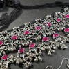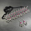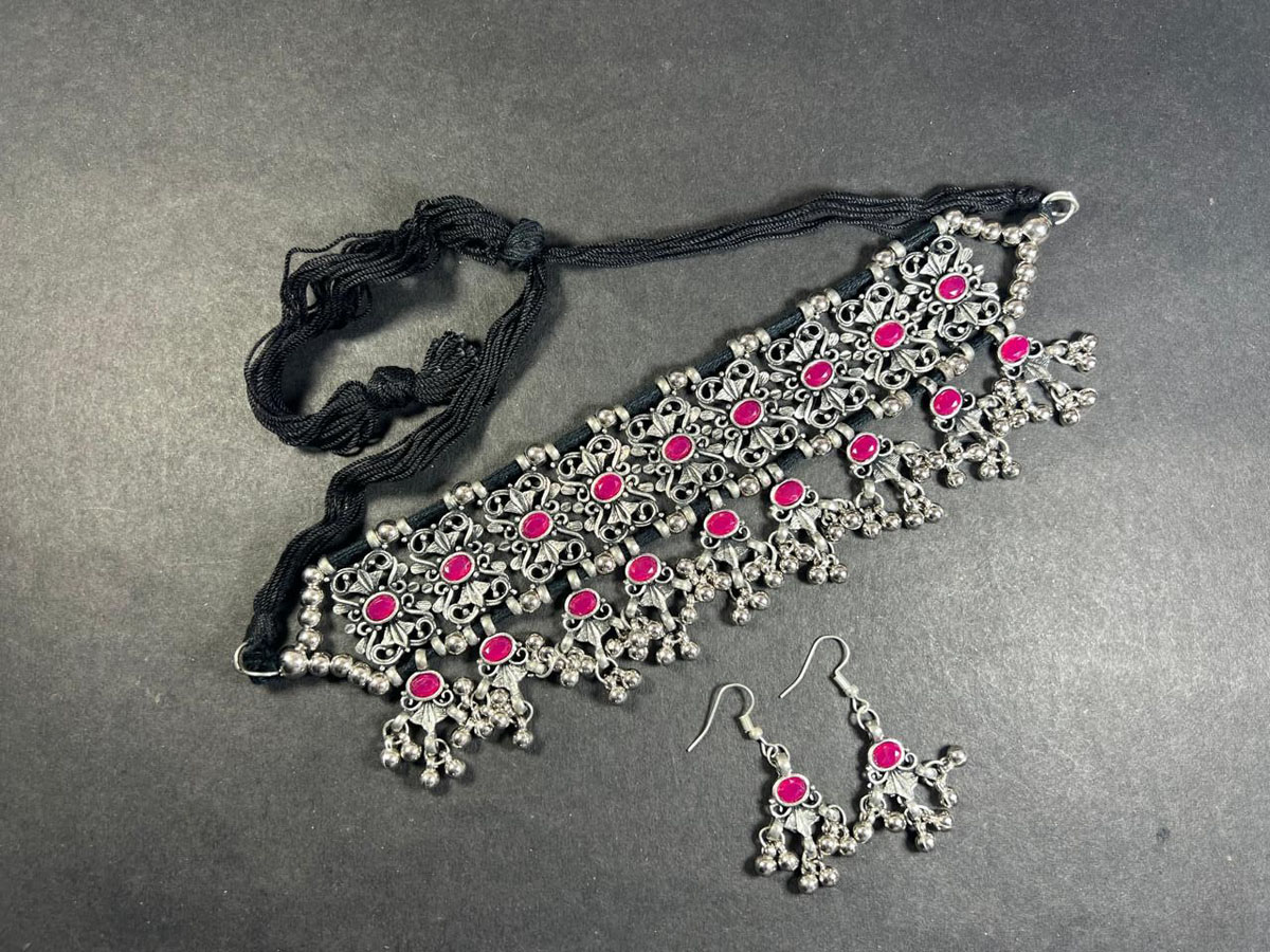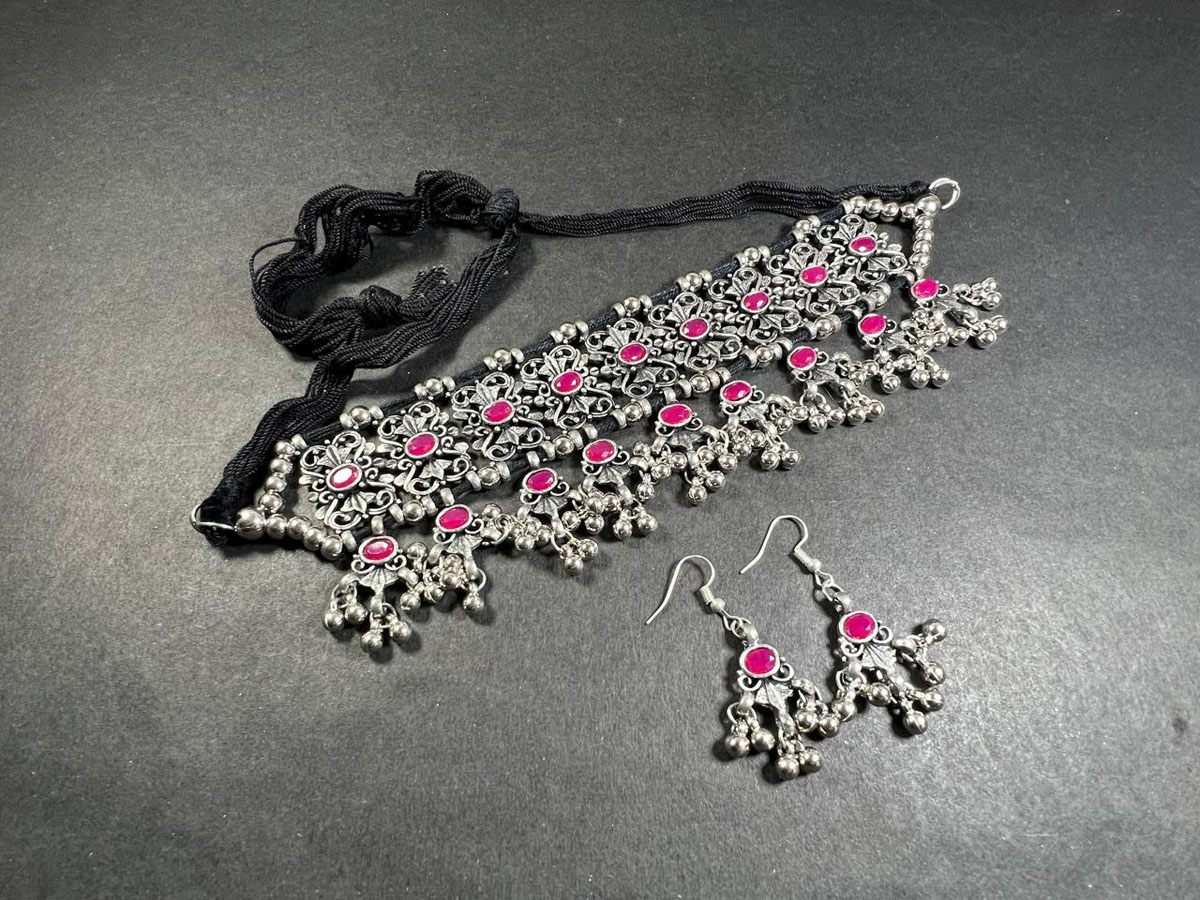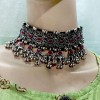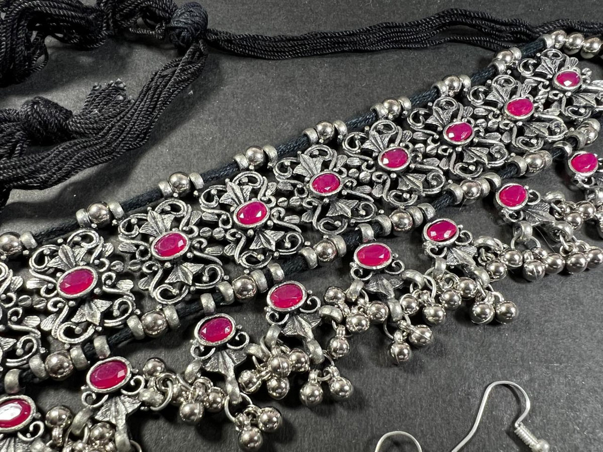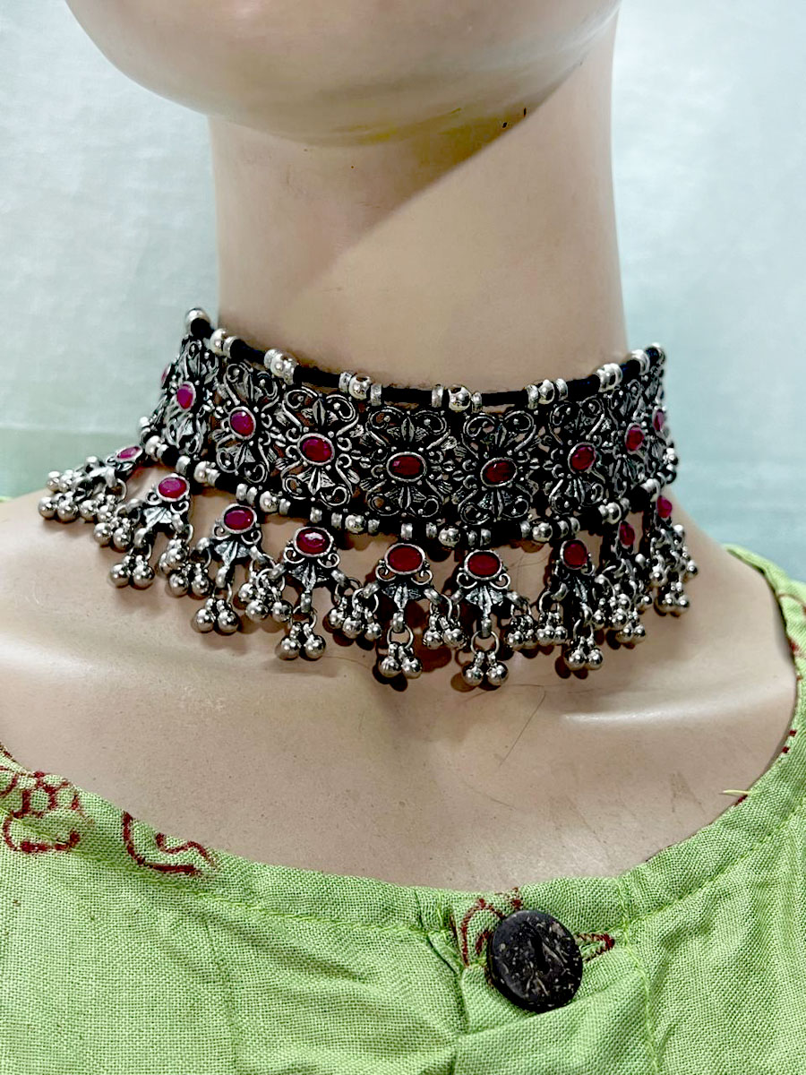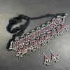 This is an ethnic, vintage, handcrafted, oxidized Afghani Banjara Necklace from India (Brand New). There is a knot of a silver tone bead inserted in the cotton thread to adjust the size of the necklace by pulling up and down as needed.