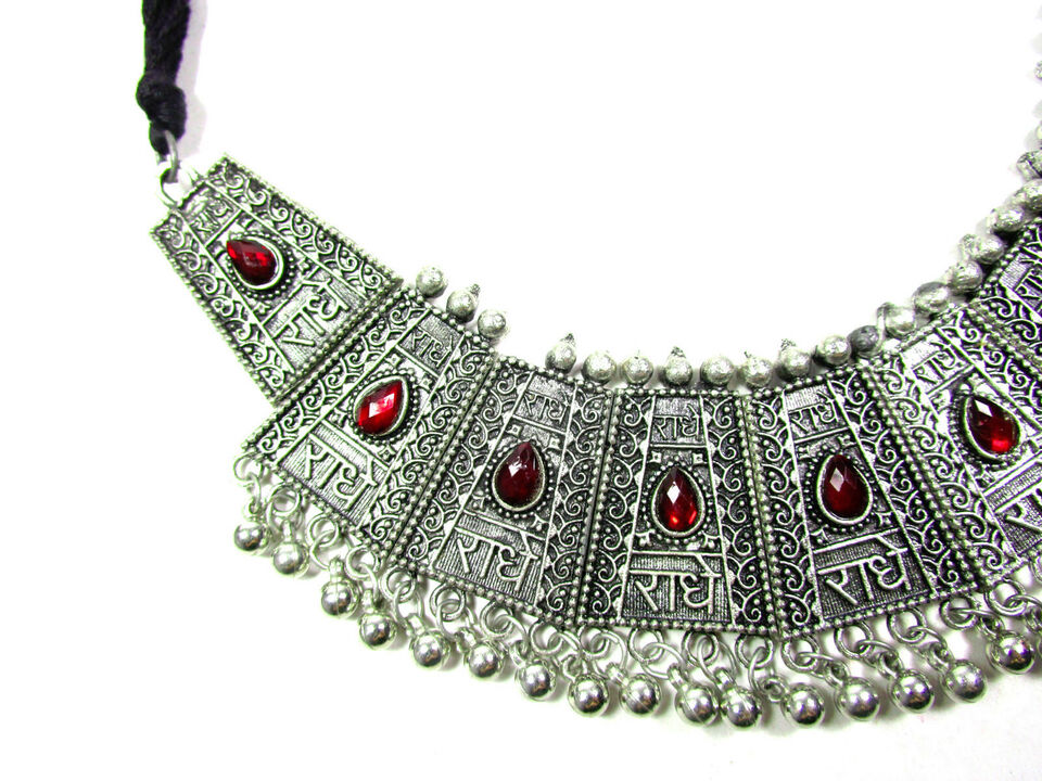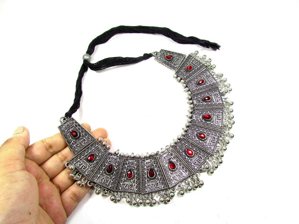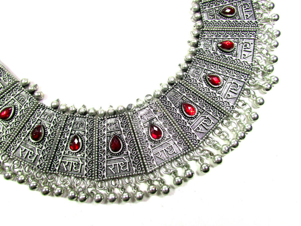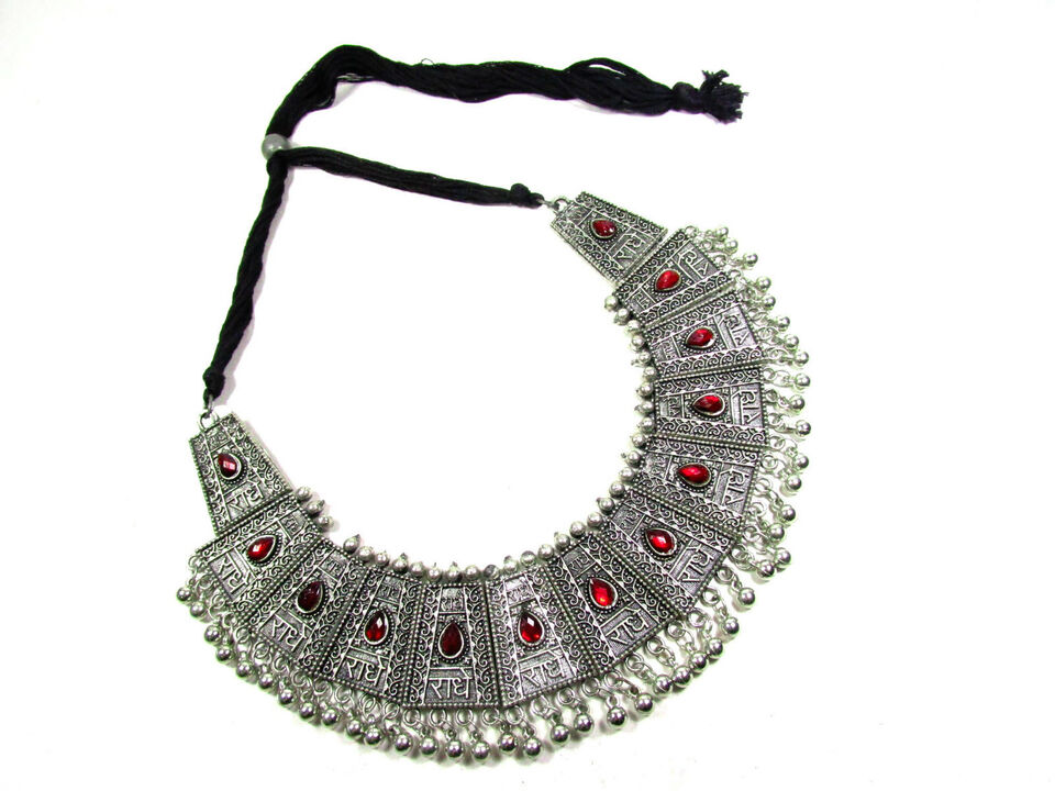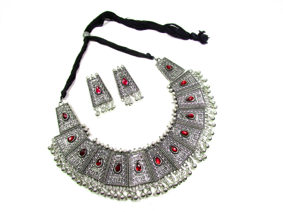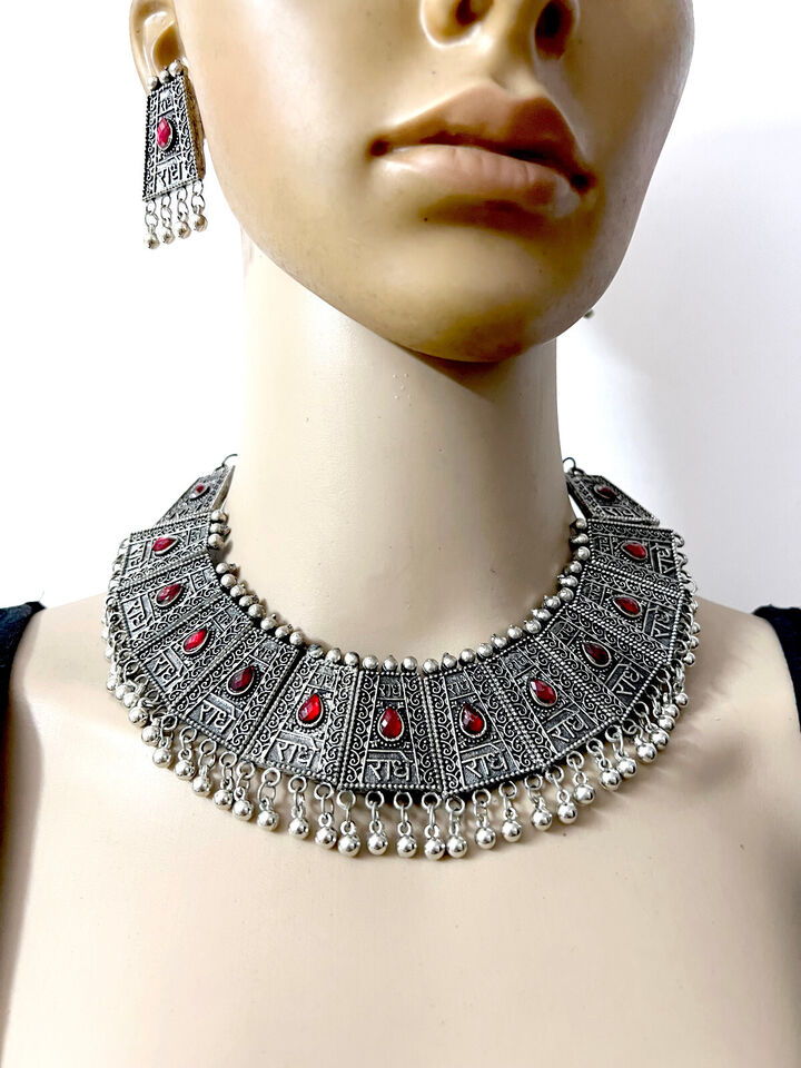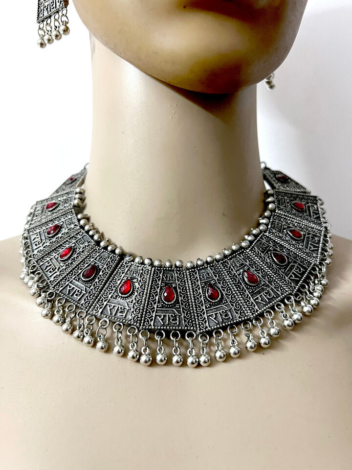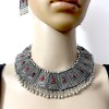 This is a gorgeous ethnic tribal Banjara design choker/statement style with real bells Antiqued Tone Necklace set earrings from India.