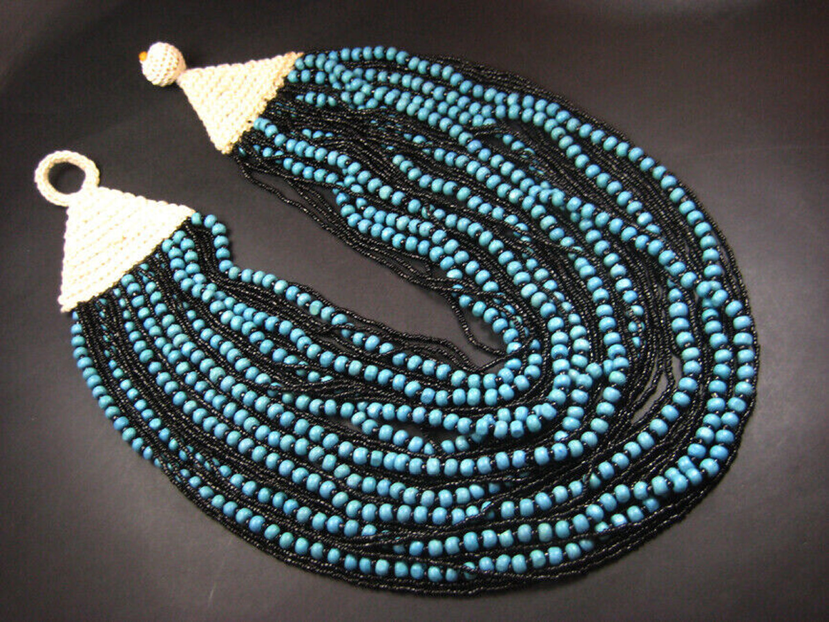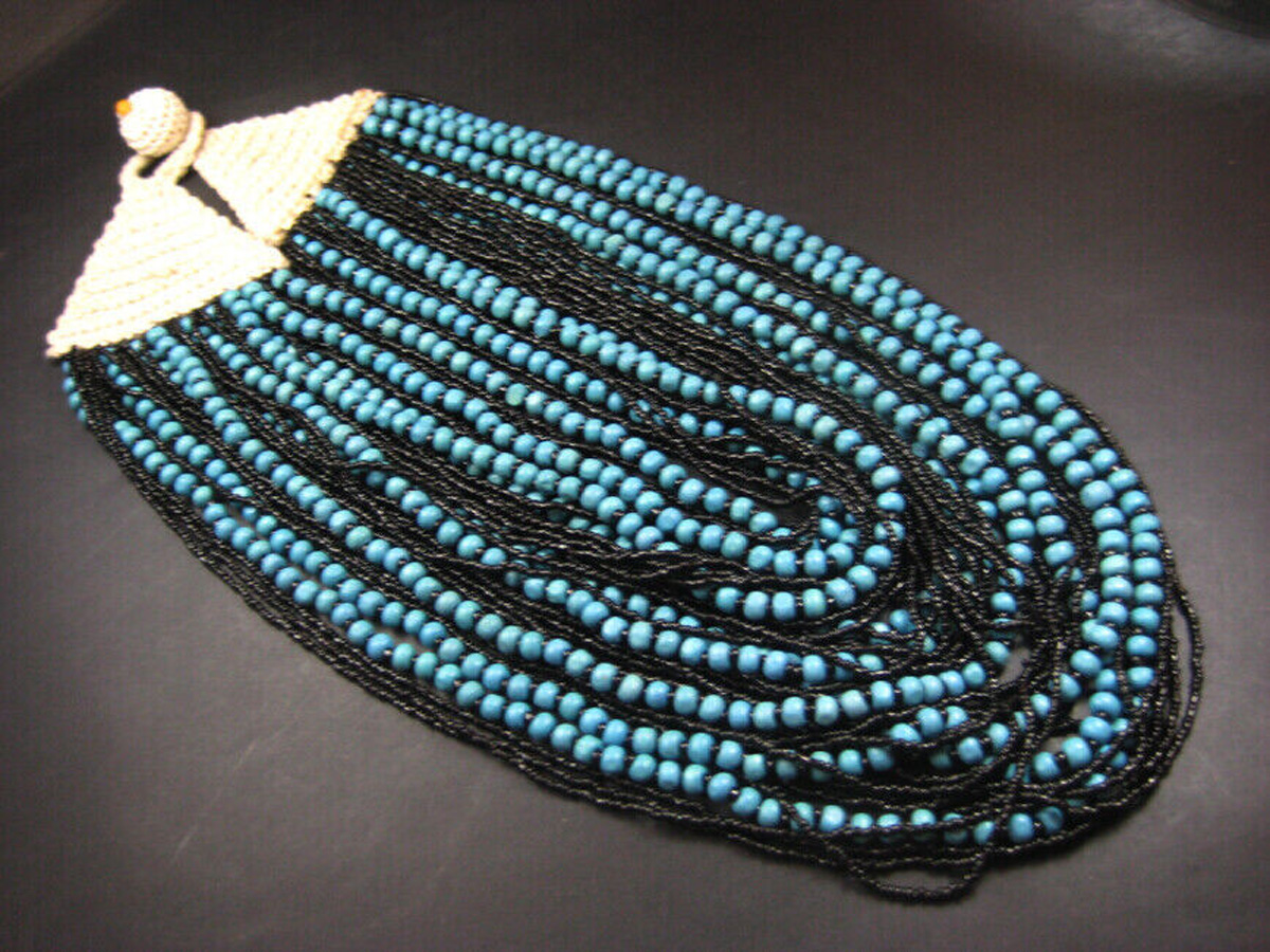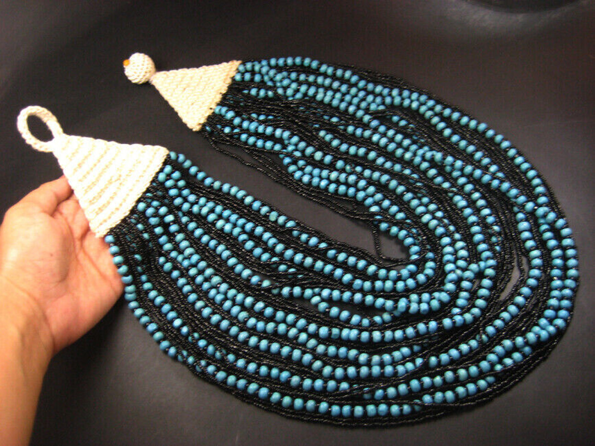 This is a gorgeous Bold, long tribal Naga, gypsy 45 multi color layers strand necklace with cotton cord crochet work from India. There is a wood button at the closure.