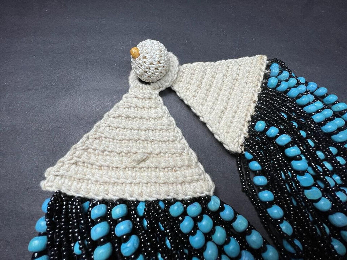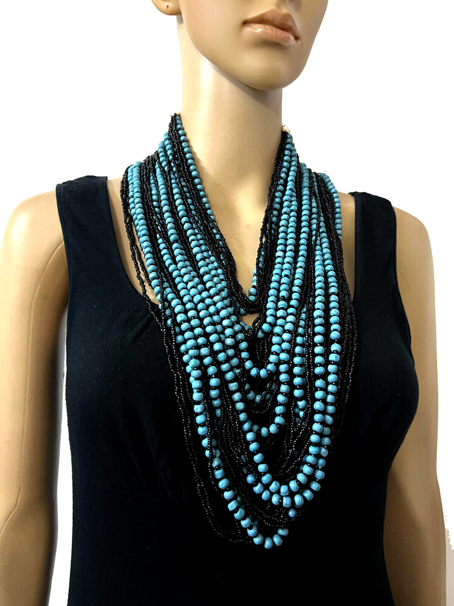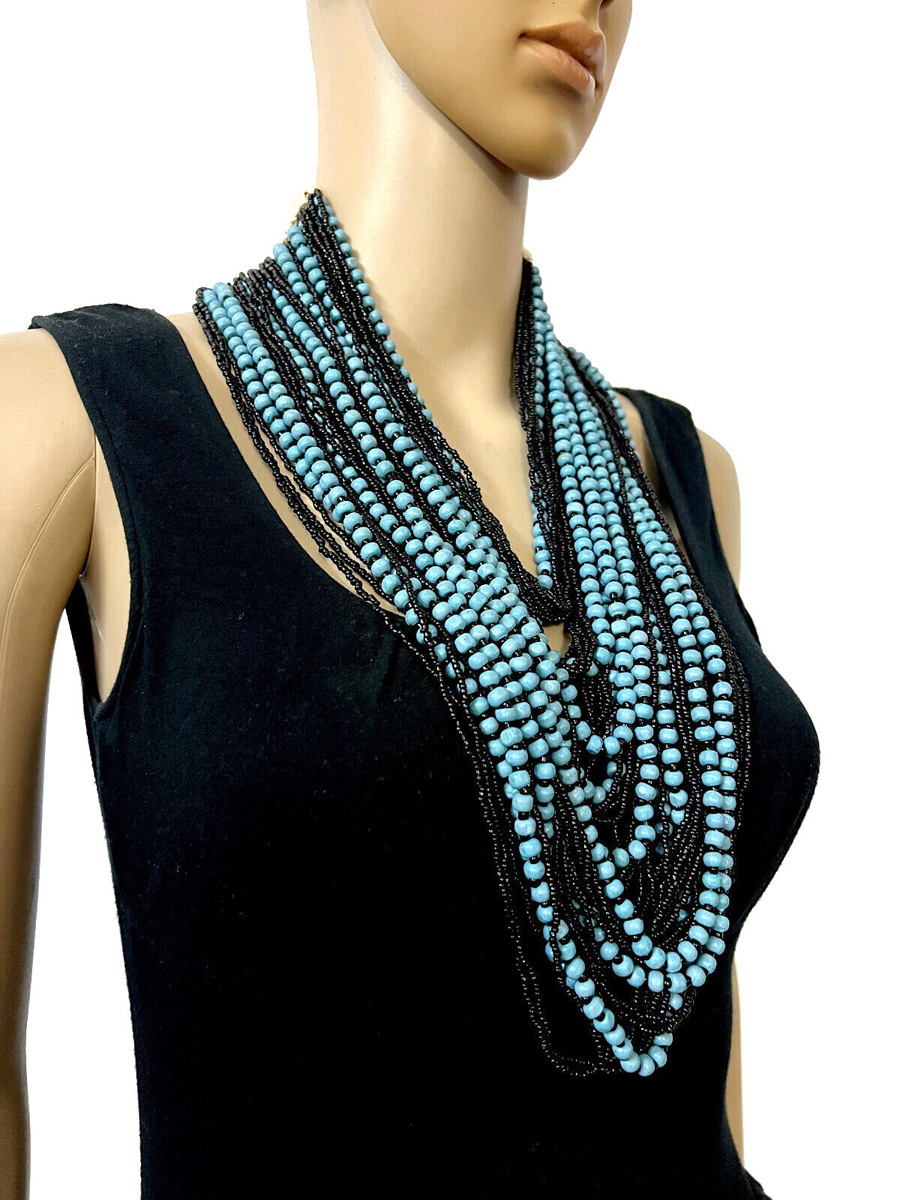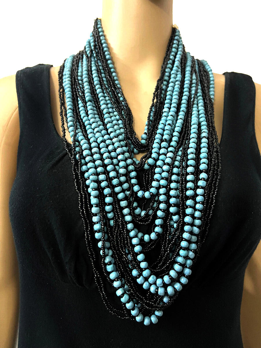 This is a gorgeous Bold, long tribal Naga, gypsy 45 multi color layers strand necklace with cotton cord crochet work from India. There is a wood button at the closure.