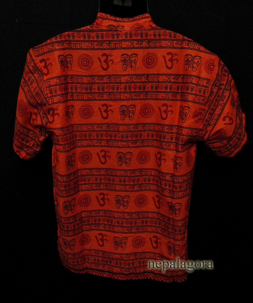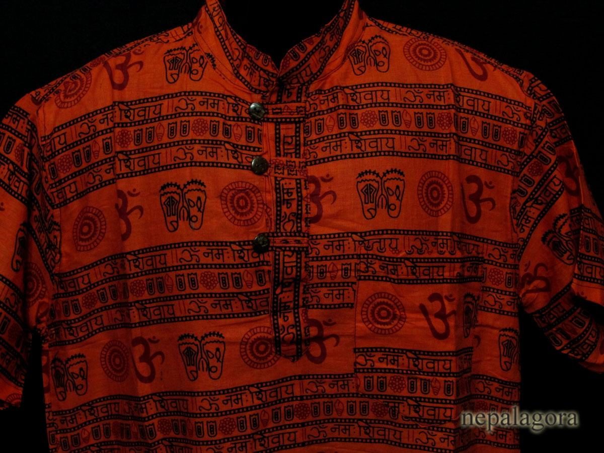 This a brand new (with tag) garment 100% cotton handloom Om Mantra with other sacred symbols block printed shirt from Nepal. This is a top having three unique wood button in the front below the collar and one pocket on left front chest with short sleeve which looks very classic and stylish. We can use it as casual wear in the summer.