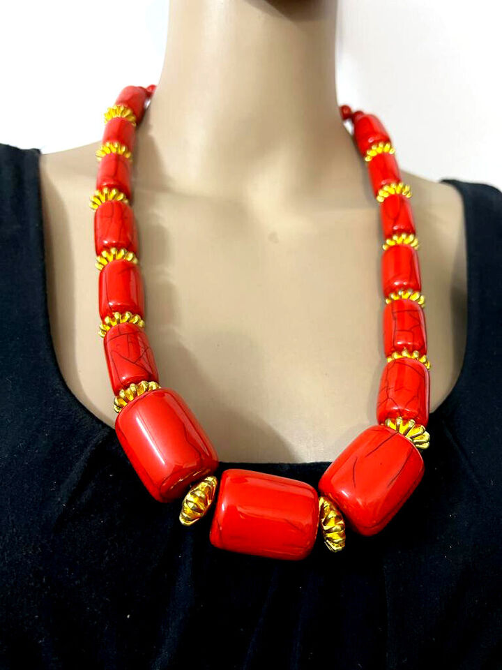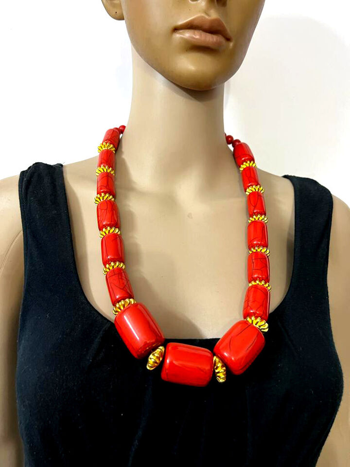 It is an ethnic Tibetan, Red color resin with brass/silver tone beads Necklace handmade from India.