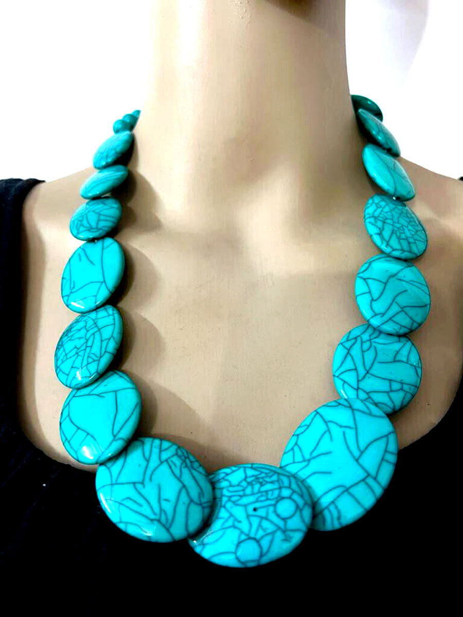 This beautiful necklace features a bold Tibetan design with oval-shaped resin beads. It offers a striking blend of traditional and contemporary style.