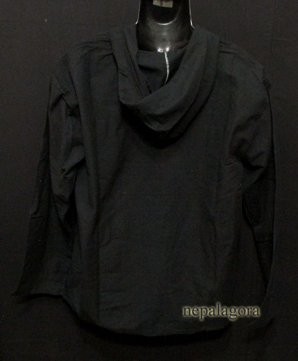 This is a brand new (with tag) garment 100% cotton handloom hooded shirt Nepal. This is a winter hoodie having three unique wood button in the front and three pockets with long sleeve. It has a drawstring at the hood and waist which looks very classic and stylish. We can use it as casual wear in the winter.