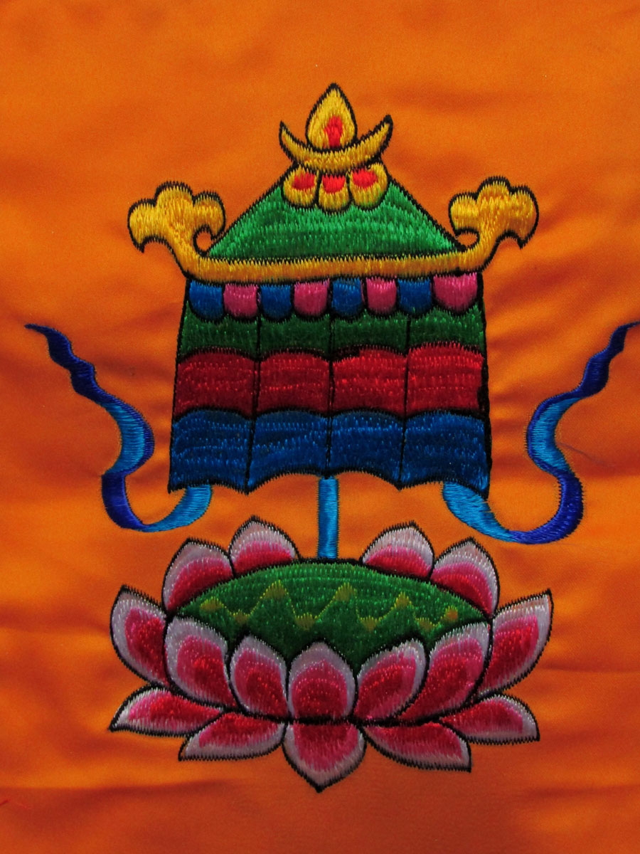 This is a beautiful silk brocade wall hanging from Nepal. This is one of the 8th auspicious sign or Sutra of Buddhism called The Victory Banner. It is decorated with beautiful hand woven silk embroidery. These thangka are handmade by the highly skilled and experienced local artisans in Nepal.