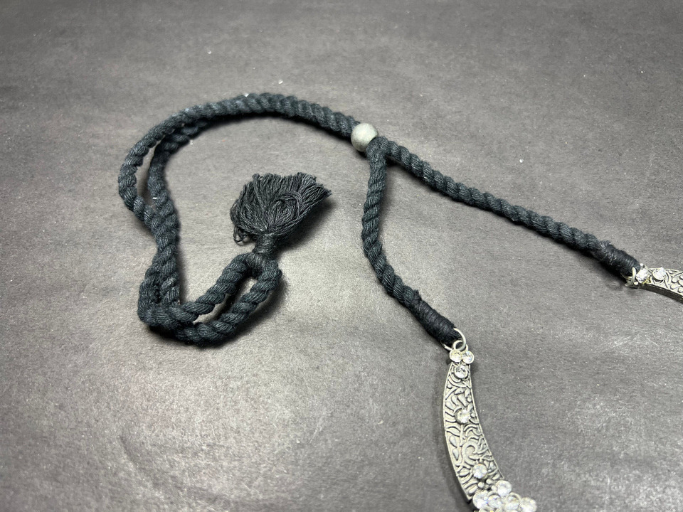 There is a knot of a antiqued tone bead inserted in the cotton thread to adjust the size of the necklace by pulling up and down as needed.